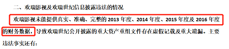 2014年,根据证监会的调查,为了完成借壳上市,欢瑞世纪在2013年、2014年、2015年和2016年连续四年未能提供真实、准确、完整的财务数据,导致欢公司公开披露的重大资产重组文件存在虚假记载及重大遗漏。